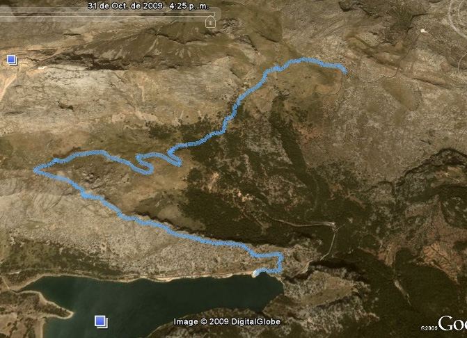 El descens ho realitzem per la cresta de la Serra de Turixant. El recorregut té adreça NE, excepte el tram final pel qual descendim fins a l'aparcament de l'embassament del Gorg Blau. El descens ho realitzem per la cresta; en alguns punts la deixem a la nostra esquerra i el pendent, en general, és fort molt fort, amb alguns trams curts molt forts. Al cap de 1h 30’/1h 40’, quan vam albirar enfront de nosaltres la presa del Gorg Blau, amb les canonades metàl·liques que ascendeixen l'aigua fins a la canalització que conduïx l'aigua a l'embassament de Cúber, descendim, amb adreça Es, pel vessant amb pendent fort. Als 4’ veurem a la nostra dreta un pal metàl·lic de conducció elèctrica, seguirem descendint, amb pendent mig, vorejant les roques que tenim a la nostra dreta i en uns 5’ arribarem al camí que conduïx a la presa des de l'aparcament del Gorg Blau. Prendrem a la nostra dreta i en 1’ arribarem a l'aparcament situat al costat de la boca sud del túnel del Gorg Blau.
